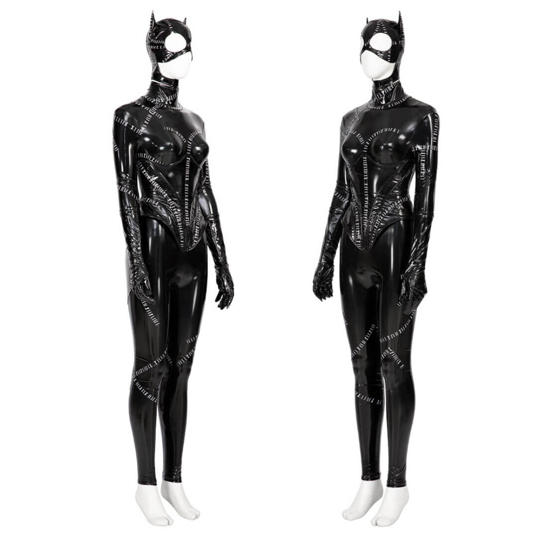 Get ready to unleash your dark side with this deluxe Batman Returns Catwoman costume! Inspired by the iconic character, Selina Kyle, this cosplay set includes a jumpsuit, waistband, headgear, gloves, whip, shoes, and nail caps. You'll be the queen of the night and the cat's pajamas with this purrfect costume.