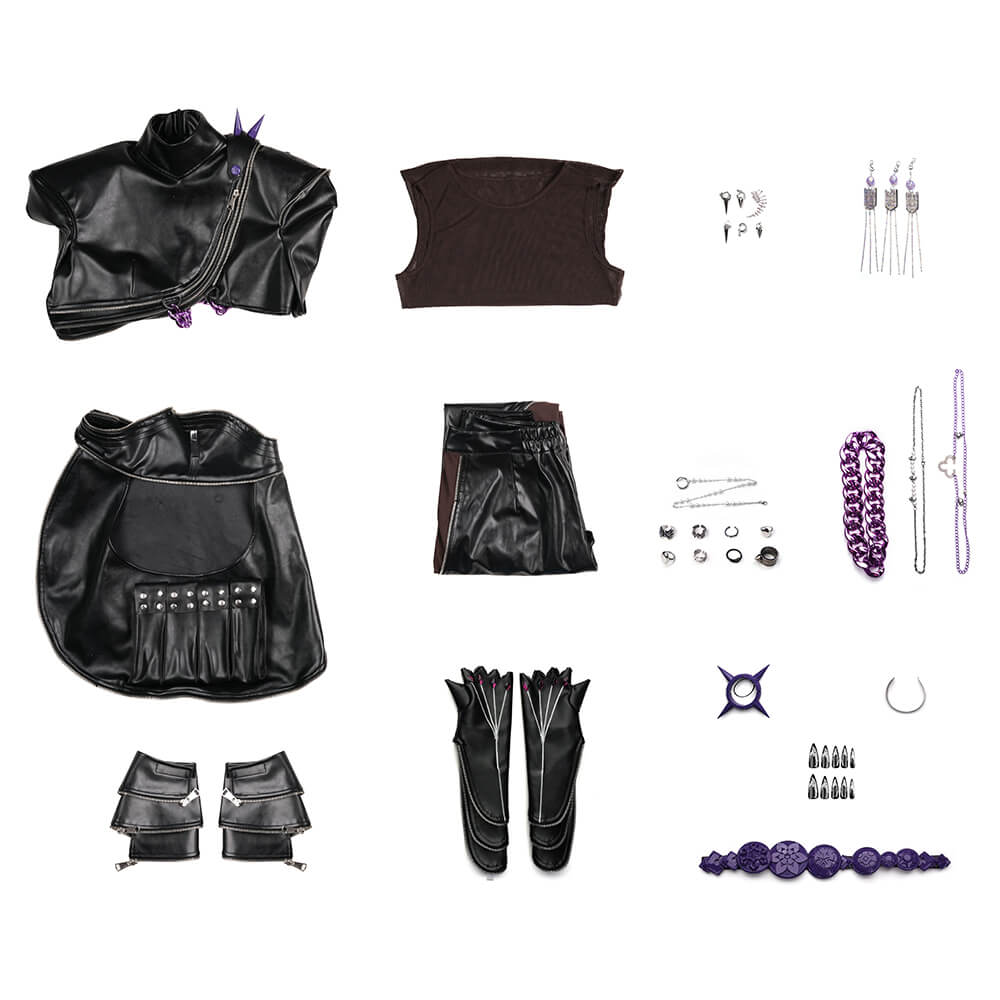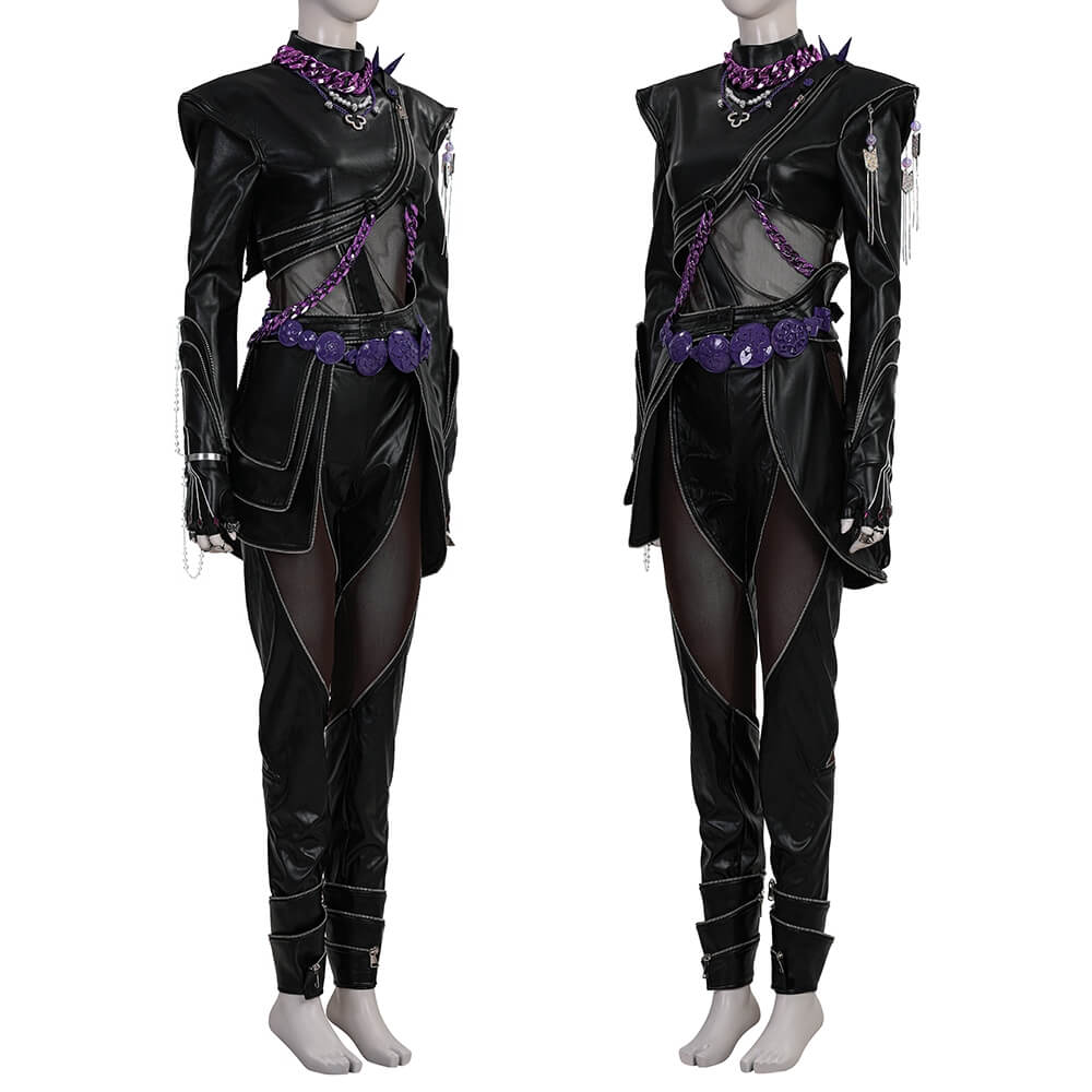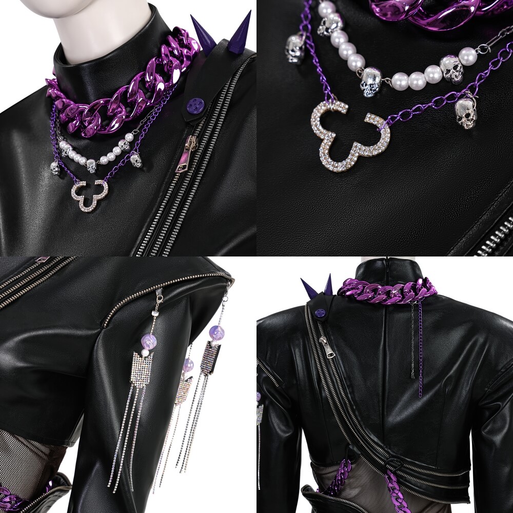 Unleash your dark side with this stunning Rumi Black Battle Suit Cosplay Costume! Inspired by the mysterious and powerful Kpop Demon Hunters, this look features a dramatic coat, intricate necklace, and statement accessories. The PU leather and coarse mesh fabric will make you feel like a true warrior, and the detailed craftsmanship will ensure that you stand out from the crowd.